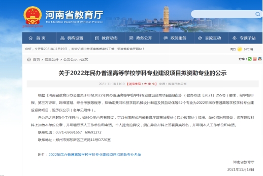 2021年11月18日,河南省教育厅官网(jyt.henan.gov.cn)公示,经济与管理学院现代物流管理专业和大数据与财务管理专业同黄河科技学院、郑州升达经贸管理学院和郑州商学院等21个学校62个专业拟确定为2022年民办普通高等学校学科专业建设资助项目。