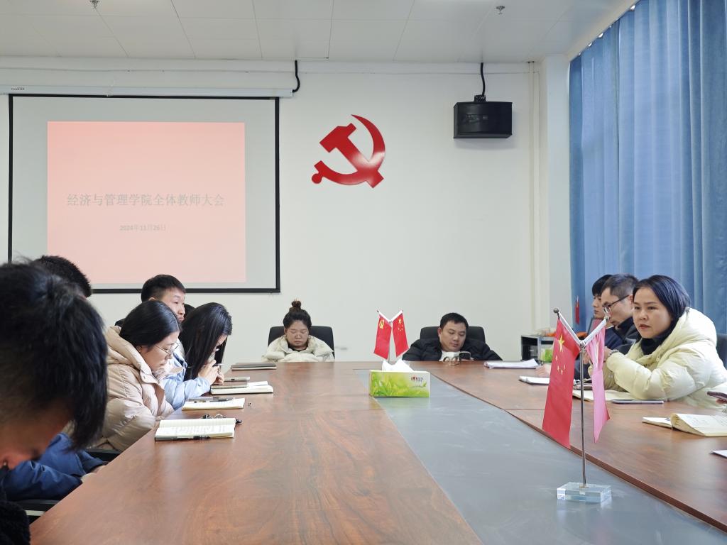 2024年11月26日下午,经济与管理学院召开全体教师会议,会议由王成院长主持,参加会议的有王力伟书记、郭秀英副院长、刁雪影副院长、牛永伟副书记以及各教研室主任、全体教师、辅导员参会。
