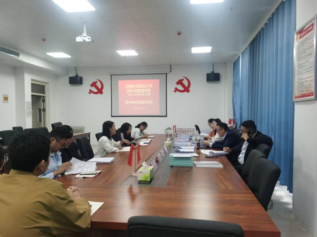 为全面贯彻学校教学管理要求,强化教学过程监控,提升人才培养质量,2025年4月24日上午,河南科技职业大学副校长师鹏一行莅临经济与管理学院开展期中教学检查工作,我院院长王成、副院长郭秀英及各教研室主任参加检查工作。