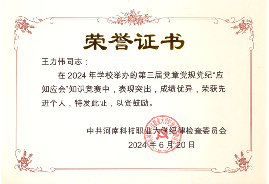 近日,河南科技职业大学2024年第三届党章党规党纪“应知应会”知识竞赛落下帷幕,王力伟同志凭借扎实的理论积累和出色的赛场表现,获评竞赛先进个人荣誉称号。